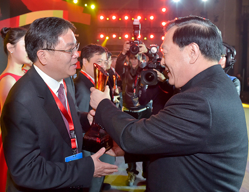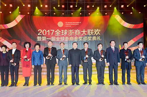 1月25日,由浙商总会、浙商总会专委会、全球各浙江商会等发起的“2016全球浙商金奖”颁授典礼在浙商总会年会现场举行,浙江省委书记夏宝龙,浙江省省长车俊,浙江省政协主席乔传秀,浙江省委副书记袁家军,浙江省委常委葛慧君,浙江省委常委赵一德,浙江省委常委陈金彪,浙江省人大常委会副主任王辉忠和浙商总会会长、阿里巴巴集团董事局主席马云出席颁奖典礼并为荣获“2016全球浙商金奖”的企业家颁奖。