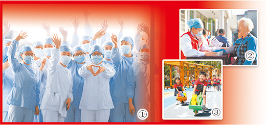 图①:2020年3月23日,湖北省武汉市第一医院的医护人员在机场为广东第14批援助武汉医疗队送行。 |
